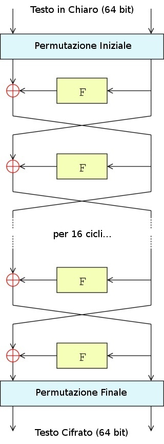 La struttura del DES è molto lineare (come si vede dalla Figura 1): ogni blocco di dati in chiaro (lungo 64 bit) passa attraverso 16 identici cicli del processo di crittazione (denominati “rounds” in inglese). Alla fine si hanno 64 bit di dati cifrati. La Permutazione Iniziale e la Permutazione Finale sono 2 processi inversi (la Permutazione Finale fa esattamente le stesse operazioni di quella Iniziale ma in ordine inverso) che non hanno crittograficamente nessun significato: si pensa che siano stati inseriti per poter caricare e scaricare più facilmente i blocchi dati nell’hardware degli anni ’70 e contemporaneamente per rallentare la velocità del DES se eseguito in software. Il simbolo rosso ⊕ indica uno XOR, cioè un OR esclusivo. La funzione Feistel (rappresentata dal blocco giallo con la lettera F) rappresenta il cuore del DES: riceve in input metà del blocco di dati, che viene cifrato con parte dei bit della chiave. L’output della funzione viene poi ricombinato con l’altra metà del blocco di dati ancora in chiaro e ne vengono invertite le posizioni prima del ciclo successivo (la metà di destra diventa la metà di sinistra e viceversa). L’ultimo ciclo non inverte le 2 metà, così che i dati abbiano alla fine la stessa posizione di partenza: questa caratteristica della struttura del Feistel rende i processi di cifratura e decifratura molto simili. Ma vediamo in dettaglio le varie strutture interne alla base del DES.
