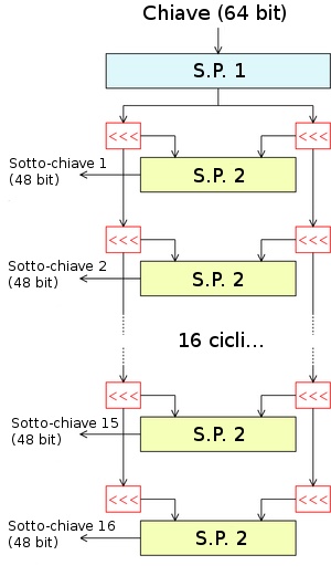Il key-schedule è un algoritmo che genera le sotto-chiavi a partire dalla chiave primaria (vedi figura 3). Dei 64 bit originali ne vengono selezionati solo 56 tramite la funzione S.P. 1 (Scelta Permutata 1); i restanti 8 bit vengono scartati (quasi sempre) o utilizzati come bit di controllo parità. I 56 bit vengono poi divisi in 2 parti di 28 bit ciascuna, ognuna delle quali viene poi trattata in maniera separata dall’algoritmo. Durante i 16 cicli, il key-schedule ruota, a seconda del ciclo, entrambe le metà così generate di 1 o 2 bit verso sinistra (i segni <<< in rosso nello schema) e poi seleziona con la funzione S.P. 2 (Scelta Permutata 2) i 48 bit da fornire come sotto-chiave alla funzione Feistel: 24 bit sono prelevati dalla pipeline di sinistra e 24 bit da quella di destra. Grazie alla rotazione, ogni sotto-chiave è formata da una diversa combinazione di bit (ogni bit è usato in 14 sotto-chiavi su 16).