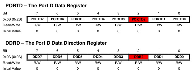 Nel registro DDRD scriveremo “1” nel bit DDR2 per impostare il pin PD2 come OUTPUT, mentre nel registro PORTD imposteremo ad “1” il bit PORTD2 per attivare il segnale HIGH.